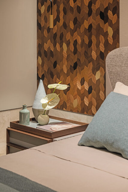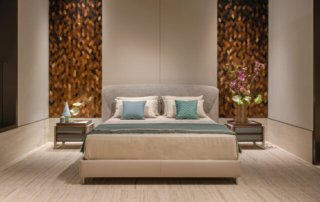 In the sleeping quarters, the atmosphere becomes more intimate. The headboard wall is dressed in finely quilted leather panels, framing the bespoke atelier bed designed by Nunziati himself, forming a harmonious dialogue between design and serenity.