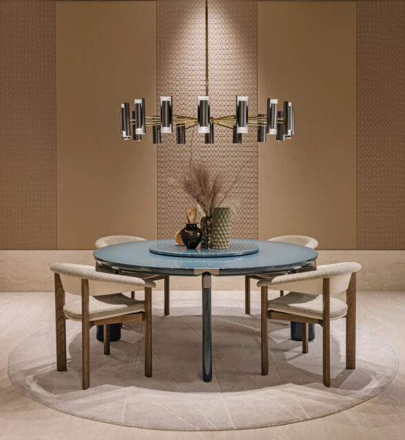 Opposite, the formal dining area is centered around a round table, enclosed by panels in woven leather and illuminated by a bronze chandelier designed by Nunziati for Tato: a sculptural and atmospheric light source.